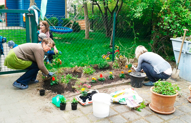 Damit alles in fröhlich bunten Farben leuchtet, wurden unsere Blumenkästen und Beete neben dem Haupteingang und Eingang Krippe mit den von Eltern mitgebrachten hübschen Sommerblumen bepflanzt.