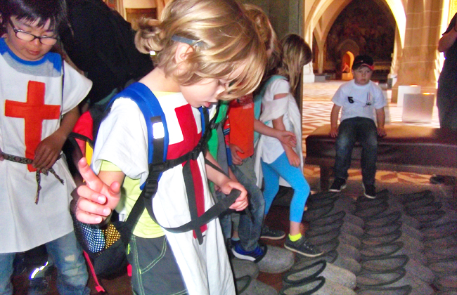 Ausgerüstet mit Ritter– und Burgfräuleinkostümen begann die Zeitreise ins Mittelalter. Die Kinder gestalteten mit viel Geschick Schilder, Schwerter, Schatzsäckchen, Pfeil und Bogen.