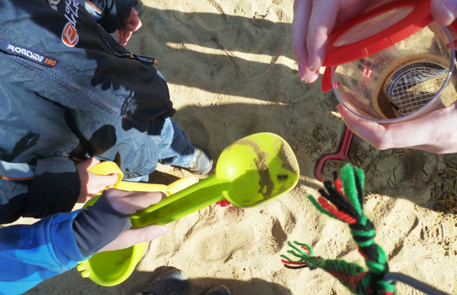 Zwei Kinder sind mutig und holen sich zur genaueren Betrachtung Bienen in eine große Lupendose. Sie sehen anders aus als die bekannte Honigbiene. Eine Imkerin erklärt uns, dass es sich um Sandbienen handelt. Sie stehen unter Naturschutz und haben wohl in unserem Sand überwintert. Das Forscherfieber ist ausgebrochen und es findet sich eine Gruppe „Bienenforscher“ die sich nun regelmäßig treffen und ganz erstaunliche Erkenntnisse gewinnen:
