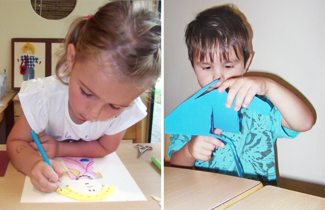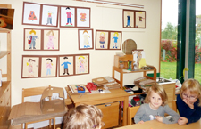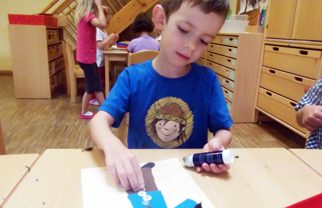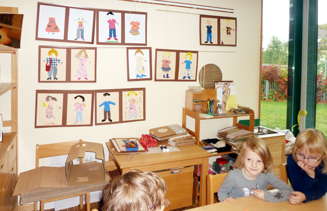 Mit viel Sorgfalt zeichneten, schnippelten und klebten die Kinder. Mädchen wie Jungen fanden sich gleichermaßen in der Stoffwerkstatt ein. Sie gestalteten ganze Familien in unterschiedlichen Anziehsachen, sie klebten verschiedene Haare und Frisuren und verschönerten manches Modell mit Ketten, Taschen und passenden Schuhen. So ist inzwischen eine ganze Modegalerie entstanden und der zunächst vorsichtige Umgang der Kinder mit echt scharfen Scheren ist sicher und sehr geschickt geworden.