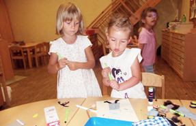 Bei Mädchen äußerst beliebt sind die Fashion Sticker Hefte in denen man ein Outfit mit Stickern gestalten kann. Wir haben deshalb dieses Interesse der Kinder aufgegriffen und eine Stoffwerkstatt eingerichtet. Hier können die Kinder aus echten Stoffen Kleider, Röckchen, Shirt’s und Hosen kreieren und dann Püppchen aus Pappe anziehen.